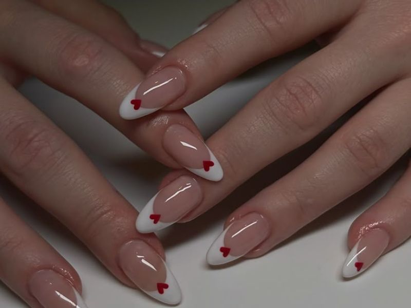 Milky white nails make the red heart details pop beautifully.